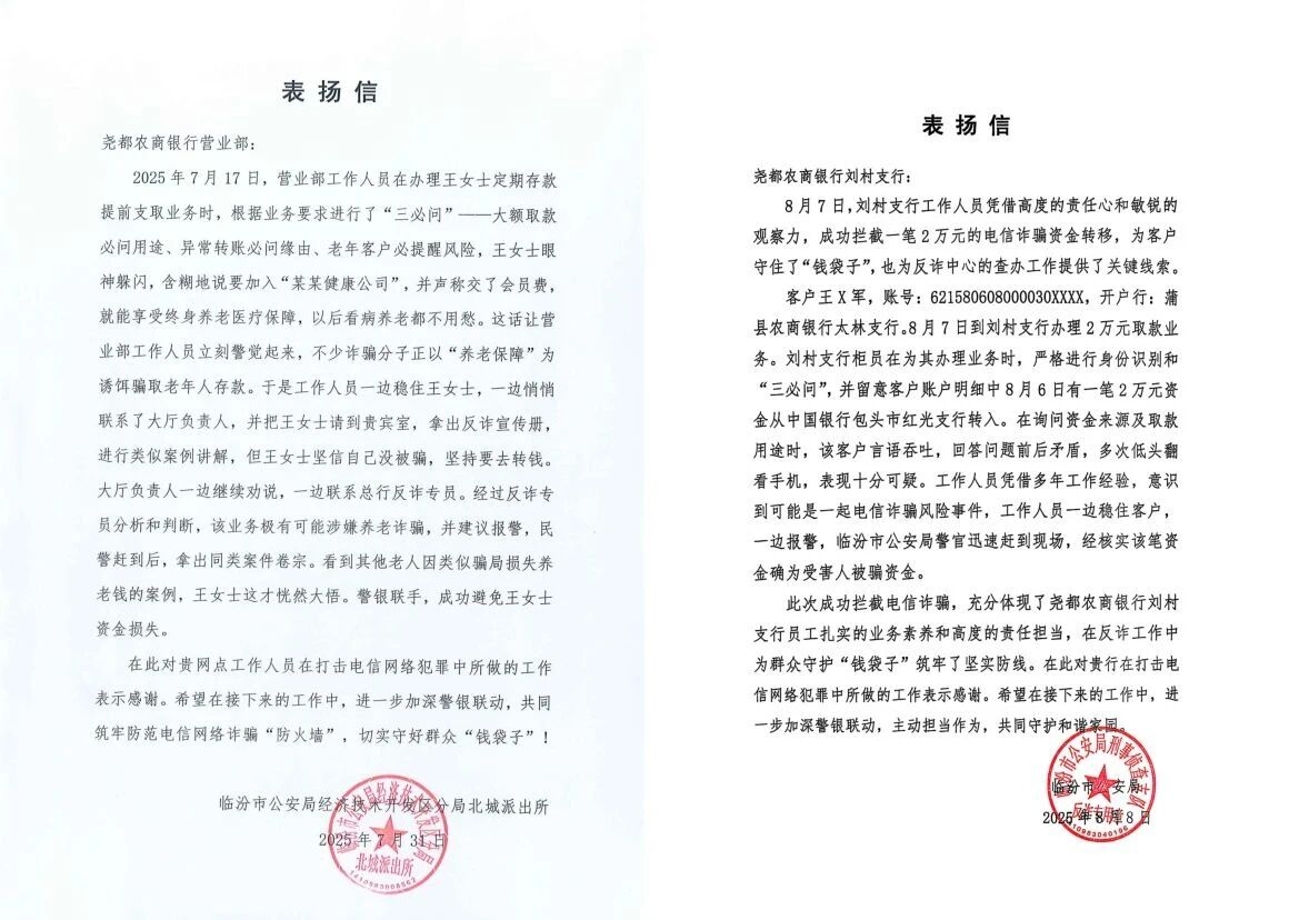 近日,尧都农商银行接连收到两封来自临汾市公安局的《表扬信》,信中对本行在防范电信网络诈骗、守护群众“钱袋子”工作中主动作为、精准拦截的表现予以高度赞扬,并特别指出:尧都农商银行以扎实的专业素养和高度的责任担当,为群众守护“钱袋子”筑牢了坚实防线,共同守护了和谐家园。