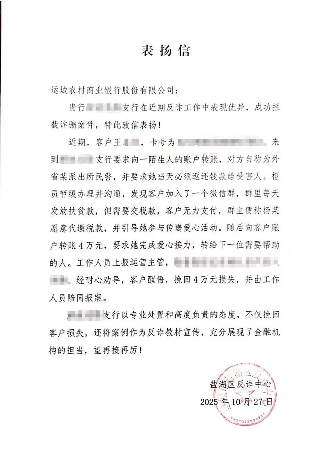 原来,王某在6月加入了一个名为“中房集团”的聊天群,该“集团”每天都会给会员发放补贴款,但需缴纳3万元税款。当王某表示无力支付时,群主称有位好心人愿意代缴税款,并向王某账户转入4万元,要求她完成“爱心接力”,转给下一位“需要帮助的人”。王某在收到4万元后察觉异常并未进行转账操作,随即就接到“外省民警”要求转账的指令,便来到银行咨询办理。工作人员立即联系辖区派出所民警到场协助处理。当民警要求与“外省同行”直接对话时,对方却闪烁其词,仅表示会通过正规渠道发文书给银行,拒绝配合身份核实。民警当场揭穿骗局,明确告知王某:“这是典型的电信诈骗手法,所谓‘爱心款’很可能是犯罪赃款,您正在被利用成为洗钱工具。”民警耐心向其解释正规司法程序:“如果是涉案资金,公安机关会依法出具法律文书,绝不会要求个人私下转账。”10月27日,运城市盐湖区反诈中心向运城农商行发来表扬信,高度肯定该行拦截4万元涉诈资金的专业表现与责任担当。