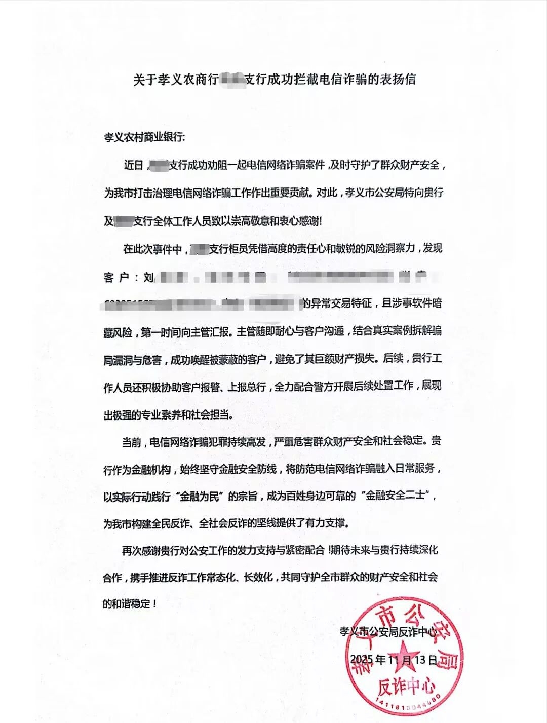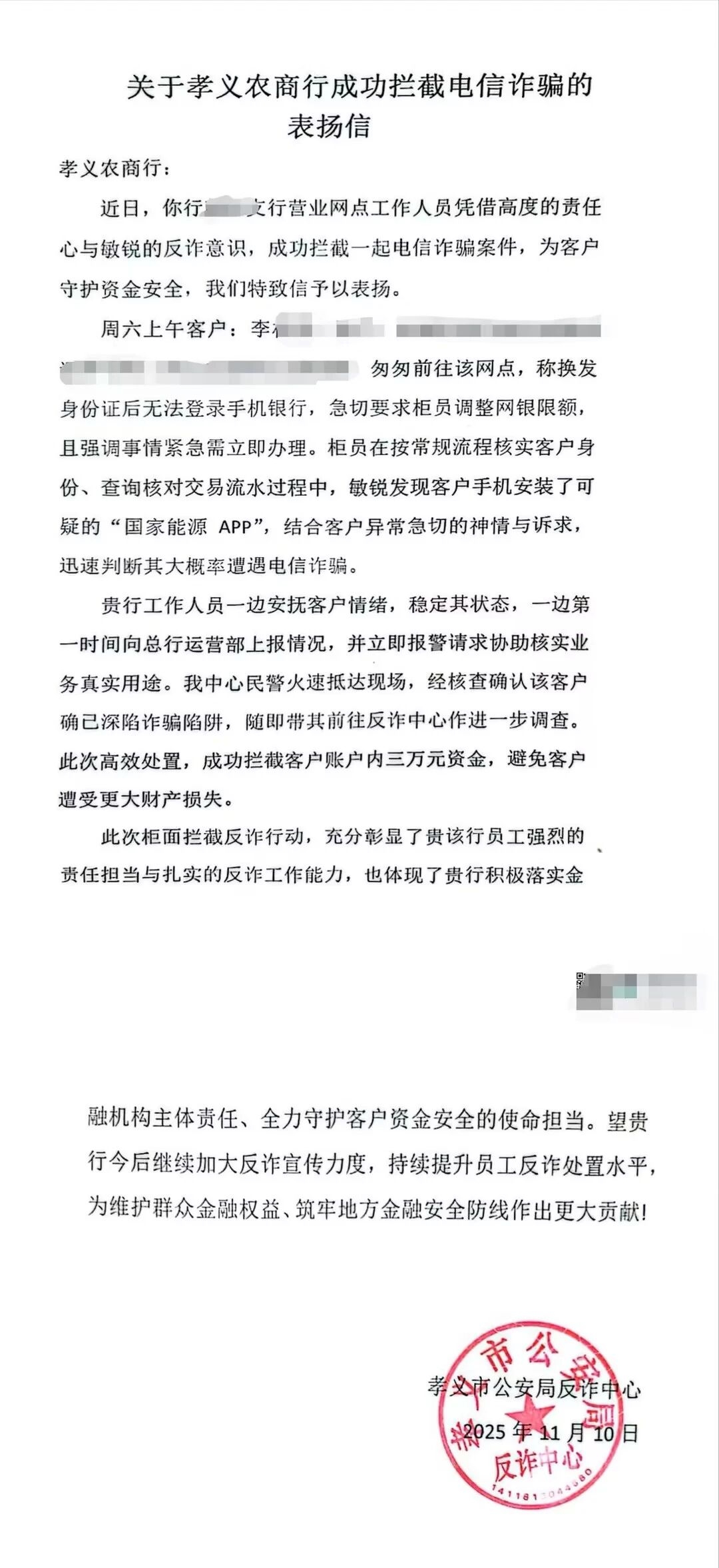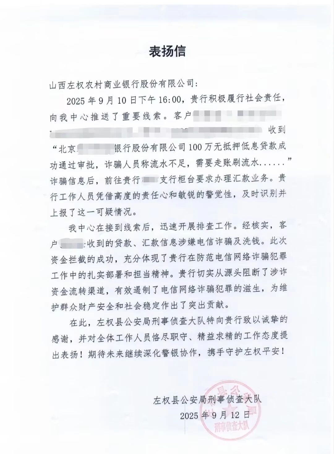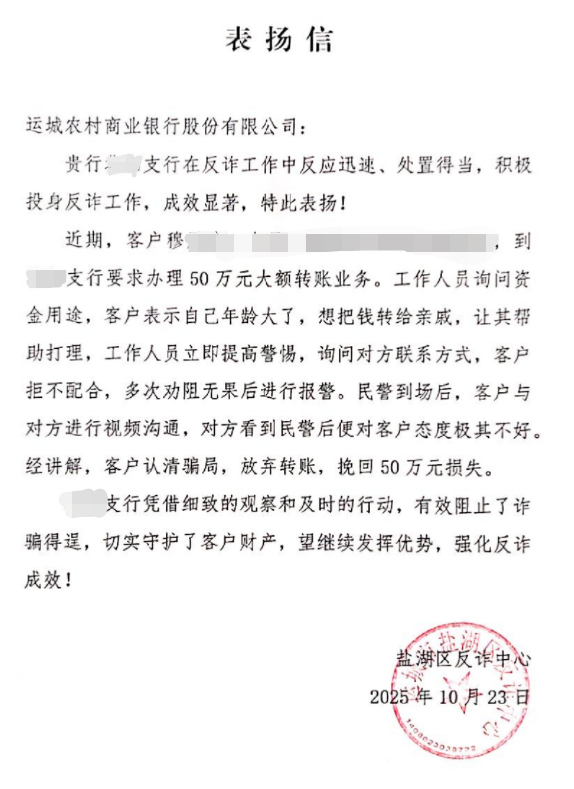 当民警赶来说服客户与所谓“亲戚”进行视频通话时,对方在看到民警后,原本伪装的友善面目瞬间转变得极其恶劣,使客户彻底醒悟,放弃转账操作,并对农商行工作人员的尽心尽责表示感谢。10月23日,运城市盐湖区反诈中心向运城农商行发来表扬信,高度肯定该行成功守护客户50万元资金安全的奉献与担当。
